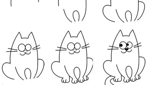Этот рисунок представляет собой пошаговую инструкцию, как нарисовать мультяшного кота. Вот описание каждого шага по порядку (слева направо, сверху вниз): Шаг 1: Рисуем только контур головы и ушей кота в виде овала с двумя острыми ушками. Шаг 2: Добавляется овальный контур тела и небольшой овал внутри — заготовка для лапок или живота. Шаг 3: Добавлены контуры передних лапок по бокам туловища...