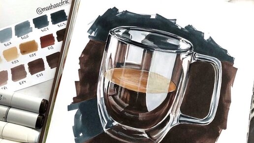 Вот и пришло время всевозможных уроков с согревающими напитками. Сегодня у нас горячий кофе ☕. Из необычного в этом уроке - он довольно простой и акцент здесь только на стакане. Мы посмотрим, как нарисовать стекло на темном фоне и при этом не закрашивать весь лист маркерами😉 1. Делаем карандашное построение. Важно сделать стакан симметричным, поэтому я провожу вертикальную линию, которая является центром. Также обратите внимание на эллипсы, специально оставила некоторые вспомогательные линии, чтобы было нагляднее...
