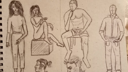 Привет Самый частый вопрос: Как нарисовать человека? Волнует многих. Человек это сложная фигура состоящая из геометрических фигур и линий. Также различия в рисовании мужчин и женщин. На примере моих набросков В общем Мужчина и женщина изображены в полный рост, сидя и в профиль. В полный рост Сидя В профиль Черты лица у женщин, как правило мягче. Губы больше нос меньше. Знаешь ли ты, что за странная разметка на лицах двух мужчин, на наброске? Это линии глаз, носа, губ, линия роста волос...