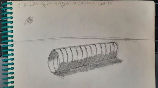 В текущем уроке необходимо нарисовать трубу! Обычную трубу, но с контурными линиями, как например у гофры по всей длине. Трубы можно брать как части тела какого-то персонажа или просто умение рисовать трубу в перспективе является полезным навыком. Выполняя указания в уроке, я без проблем нарисовал данный предмет. Но результат меня не устроил, от слова "совсем". После этого я начал пробовать еще и еще раз. И результат становился только хуже. Я даже попробовал нарисовать с двумя линиями на горизонте...