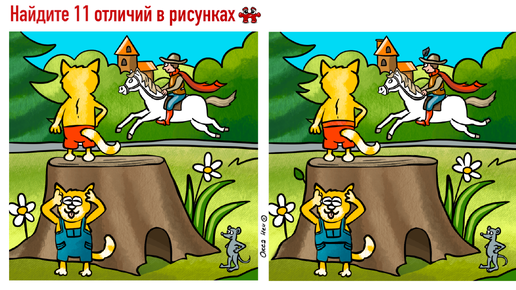Найдите 11 отличий на картинке про всадника на коне и двух котят. Внимание и развлечение.