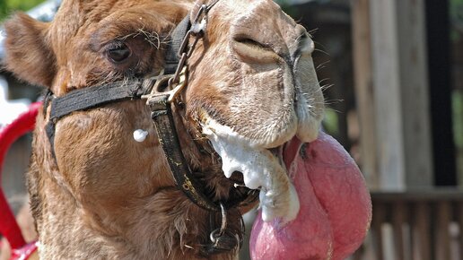 Верблюды – удивительные животные. Они преодолевают десятки километров по раскаленной пустыне, не пьют неделями и лечатся змеями. Кроме того, у этих животных особая тактика и механизм ухаживания за самками. Удивительно, но чтобы привлечь особь противоположного пола верблюды самцы выплевывают изо рта «желудок». Вот как они это делают (впечатлительным советуем не смотреть). Иногда изо рта верблюда во время стоянок вываливается особый неприятный на вид пузырь. Этот мешок ни за что нельзя трогать, так как даже самый спокойный зверь в этот момент может прийти в ярость...