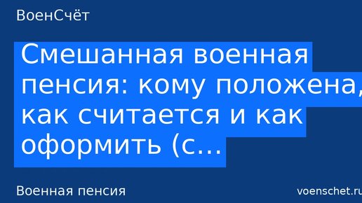 Смешанная военная пенсия назначается тем, кто выполнил условия «25 лет стажа + 12,5 года службы + 45 лет». Ниже разбираем, как смешанная военная пенсия считается и какие документы нужны. Это пенсия за выслугу лет по п. «б» ч. 1 ст. 13 Закона № 4468-1 (а не отдельный вид пенсии). Право возникает при выполнении трёх условий на день увольнения: Включают периоды по правилам подсчёта трудового/страхового стажа: — стаж до 2002 г. по «гособеспечению»; — стаж по Закону о трудовых пенсиях; — стаж по Закону «О страховых пенсиях»...