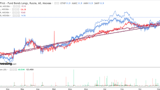 По чисто техническим причинам - простота и удобство - взяты не индехи полной доходности, а БПИФы на соответствующие классы ОФЗ. На линкеры графики полной доходности и днём с огнём не сыщешь. Чтобы нивелировать различия во внутрикорпоративных политиках - взяты БПИФы одной и той же корпорации (Сбера). Единственный не-сберовский БПИФ - INFL, БПИФ ИНгосстраха на ОФЗ 52й серии (линкеры, красная линия). Единственный не-ОФЗшный БПИФ - SBMM, фонд денежного рынка (хотя, конечно, можно считать, что в его основе заложены короткие ОФЗ 26й серии; толстая фиолетовая прямая линия)...