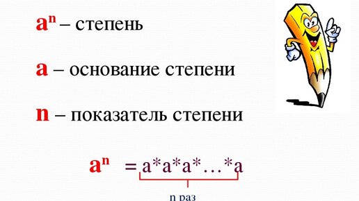 Степень — очень важная тема. Нам необходимо знать Для этого давайте рассмотрим правила: Во-первых, степень или показатель, находится вверху вашего числа и записывается маленькой цифрой!) Во-вторых, чтобы посчитать число в степени, нам необходимо умножить число само на себя столько раз, сколько указано в степени...