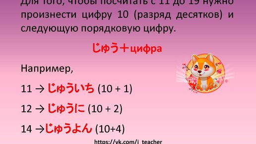- Умею считать по-японски до 10, а как считать дальше? Для того, чтобы посчитать от 11 до 19 нужно назвать разряд десятков и добавить нужную цифру. Например, 11 - じゅういち/Дзю: ити (10 и 1). Для того, чтобы...
