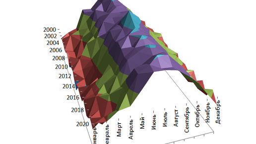 В предыдущем примере мы обсуждали способ построения графика "тепловая карта". Это весьма информативный тип визуализации. Но что, если нам захочется сделать получить не плоскую, а объемную картинку. Excel способен нам в этом помочь, т.к. имеет функционал по визуализации трехмерных поверхностей. Но также имеется и существенное ограничение, но о нем позже. Данные мы будем использовать те же, что и раньше. Это информация о среднемесячной температуре в Москве за 2000-2020 гг. В теории трехмерный график должен в предоставить визуальную информацию в легко воспринимаемом виде...