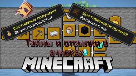Всем привет! На связи Майнблогер +! В майнкрафте десятки достижений(они же ачивки) , а с каждым обновлением их становится всё больше и больше. Для большенства игроков это просто дополнение к игре не имеющея смысла, мало игроков специально выполняют их, а ещё меньше знают тайных смысл их названий . И сегодня (или завтра) я расскажу о нескольких таких ачивках. Я буду расберать именно версии ачивок на русском языке. Арбалистика . Что бы выполнить это достижение нужно убить 5 мобов одной стрелой из арбалета с чарами "пронзающея стрела"...