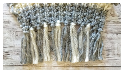 Бахрома – это универсальный прием отделки края изделия. Бахрома может быть разной по длине и густоте. Это вы регулируете сами. Но не все умеют ее делать. А делается она очень просто. Вам потребуется пряжа для бахромы, крючок, ножницы и само изделие. Это кончик шарфа. Берем нить и нарезаем ее на отрезки. Причем нить вы можете брать любого цвета. Длина должна быть в два раза больше длины предполагаемой бахромы и плюс припуск на узел. Я взяла двух цветов, так как шарф у меня двухцветный. Нити сложите пополам, введите крючок в край изделия и вытяните нити в виде петли...