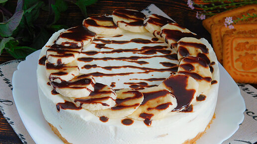 Сегодня готовим нежный и легкий десерт, на столе воздушный банановый торт. Удобно, что все можно сделать быстро и без выпечки. В основе корж из песочного печенья, а на нем слой творожного крема с кусочками бананов. В жаркий день можно убрать десерт на час в морозилку для лучшего охлаждения. Этапы приготовления: 1. Подготовить все необходимое. Желатин залить холодной водой и оставить для набухания, по времени ориентироваться на указания на упаковке. 2. Печенье измельчить до состояния мелкой крошки...