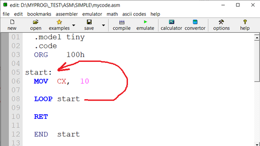 Любой цикл в любом языке программирования можно сделать бесконечным. В некоторых случаях для этого придётся постараться, но в большинстве случаев стараться не надо. Простая невнимательность обычно приводит к тому, что программа зацикливается. Вот вам несколько способов сделать цикл бесконечным в Ассемблере. Способ 1: инициализация счётчика после метки Здесь мы немножко ошиблись, и сделали так, что новое значение в счётчик записывается ПОСЛЕ метки, к которой нас возвращает команда LOOP. Поэтому счётчик никогда не обнулится, и программа никогда не закончится...