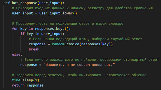 Привет! Сегодня мы научимся создавать простого чат-бота на Python. Этот бот будет отвечать на стандартные приветствия и вопросы, такие как "Привет!" и "Как дела?". Готовы? Тогда начнём! Шаг 1: Установка необходимых библиотек Для начала нам понадобится библиотека random, которая уже встроена в Python, и библиотека time. Random поможет нам выбирать случайные ответы, а time добавит задержку перед ответом бота, чтобы он выглядел более реалистично. Мы создадим словарь, в котором будем хранить стандартные вопросы и соответствующие им ответы...