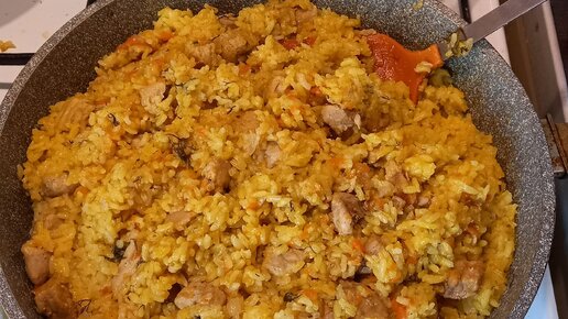 1. Нарезаем мясо на кусочки. Выкладываем в большую глубокую сковороду, обильно смазанную растительным маслом. Тушим под крышкой где-то 15 минут, переодически помешивая. 2. Тем временем нарезаем лук, натираем морковь. 3. Засыпаем к мясу лук, затем морковь. Добавим соль, перец, приправу к плову по вкусу. Всё хорошо перемешиваем. Затем добавим немного воды и тушим под закрытой крышкой ещё 15-20 минут. 4. Добавим зубчики чеснока. 5. Засыпаем, предварительно промытый, рис и разравниваем его по всей поверхности...