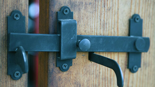 Недавно на просторах интернета наткнулся на интересную статью, о том как сделать "потайной" замок, на своем участке. Конструкция довольно простая. Ссылка на источник Такая проблема пожалуй знакома многим садоводам и сейчас я поделюсь одной уловкой, которая прослужит вам не один год. Предлагается оборудовать дверь самодельной, секретной защелкой. Вот так выглядит такой замок на воротах, как у всех. На металлическом основании закреплена на оси щеколда. Направляющая не дает щеколде отклоняться от нужного направления...