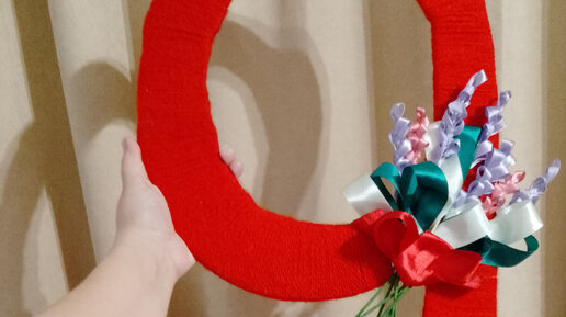 Еще одна поделка ко "Дню Победы". Нам понадобится картон, нитки для вязания красного цвета, атластные ленты, деревянные шпажки, клей пистолет или супер клей, гуаш и кисточки. Рисуем на картоне цифру " 9" И вырезаем ее. Плотно обматываем картонную заготовку нитками для вязания. Края закрепляем с помощью клея. Из атластные лент, нарезанных не большими кусочками, делаем петельки и приклеиваем к деревянным шпажках клеевым пистолетом. Получается цветочки. Так же делаем заготовки для листочков и приклеиваем их к шпажкам...