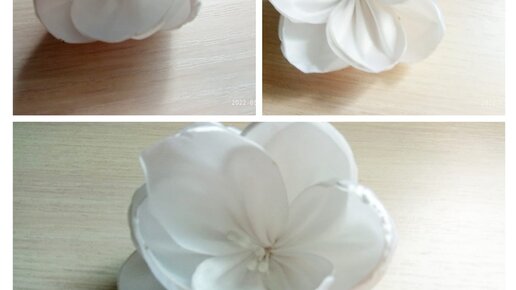Сегодня, я покажу Вам как сделать красивый цветочек из ленты шириной 5см. Эти цветы называются "Дюшески". Для работы нам понадобится: Атласная лента шириной 5см Приступим: Для цветочка нам потребуется 12 лепестков. Для этого мы нарезаем ленту на 12 отрезков по 5см. На это уйдет 60 см ленты Каждый отрезок, мы загибаем, отрезаем уголки и опаливаем над свечой, формируя лепесток. Смотрите фото ниже: Делаем это со всеми лепестками. Наш цветочек будет состоять с двух рядов. Один на лепестков и тычинки, второй на 7 лепестков Начинаем сшивать, нижний ряд на 7 лепестков...