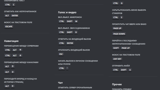 Общие комбинации клавиш 1) Ctrl + F - поиск текста в выбранном канале 2) Ctrl + K - открывает окно поиска каналов по всем серверам, на которые вы подписаны 3) Ctrl + P - открывает окно со списком закрепленных сообщений на канале 4) Ctrl + E - открывает палитру смайликов 5) Ctrl + G - вызывает средство выбора анимированных GIF картинок 6) Ctrl + Shift + H - открывает справочный центр дискорд в браузере Сочетания про которые все знают: 7) Ctrl + X - вырезать выделенный текст 8) Ctrl + C - копировать...