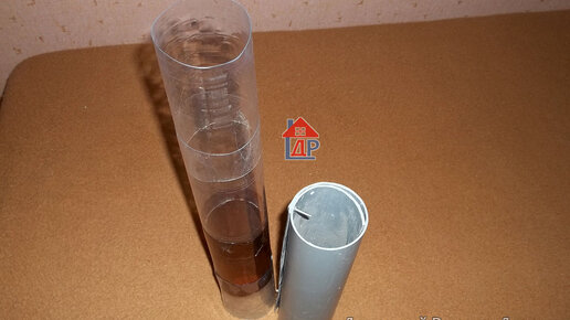 Задумал изготовить трубу из пластиковых бутылок, способ видел в интернете, решил его испытать. У меня получилось два варианта и диаметра получения трубы. Первый вариант В качестве шаблона использовал трубу для канализации на 50, решил, что при усадке бутылки, стенки получатся толще, а значит и прочнее. Разрезал с помощью болгарки вдоль и для распорок использовал клинья из обрезка доски. Надел заготовку на шаблон и обдул феном, затем в нахлест вторая заготовка. Для съёма убирались клинья и снималось готовое изделие, которое могло работать, как водоотвод...