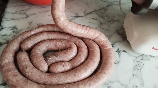 Ну вот. Забрали мы вчера заказ с WB, оболочку для колбасок и насадку на мясорубку. По пути купили килограмм свинины. Дома мясо прокрутили. Муж помогал. В фарш я добавила лук, чеснок, зелень петрушки, соль, перец, хмели сунели. Понемногу добавляла холодную воду и вымешивала фарш примерно минут пять. Всё делала на глаз и по ощущениям . Оболочку замочила минут на 10, а потом промыла от соли. Потом убрала из мясорубки нож и сетку, поставила насадку для купатов, надела на неё оболочку и процесс пошел...