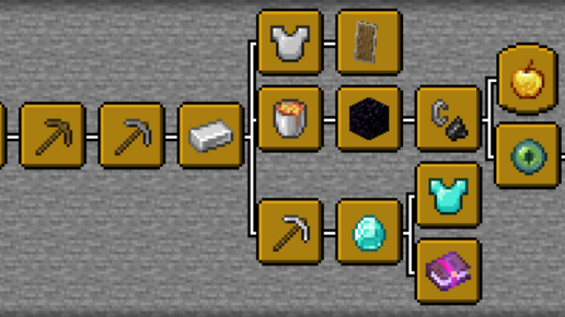 Система достижений состоит из «деревьев», каждое из которых оканчивается целями или испытаниями. Таких «деревьев» всего пять: ▪ Minecraft: Главная история игры.