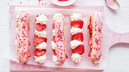 Пошаговый рецепт с фото. Эклеры с клубникой, взбитыми сливками и глазурью умопомрачительно вкусны и столь же красивы! Заварные пирожные – фавориты любой кондитерской. А вы знаете, что эклер появился благодаря придворному повару Наполеона I? Кстати, знаменитый кулинар успел и в России поработать. Всего несколько месяцев, но за это время при дворе императора Александра I произошла настоящая гастрономическая революция! Что понадобится: кондитерский мешок с насадкой «Звезда»; бумага для выпечки; миксер...