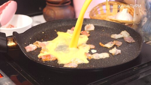 Вот как из 3х куриных яиц можно накормить целую семью. Получается аппетитный кавказский завтрак и всего минут за 15. Дешево, сытно и очень вкусно. Ингредиенты все простые, а главное – доступные. Процесс приготовления: Для начала бекон нарезаем на небольшие ломтики. Конечно же, можно взять и докторскую колбасу, и любимые сосиски. Часть подготовленного бекона обжариваем до приятной хрусткости на сухой, хорошо прогретой скороде. Если использовать другой мясной ингредиент, то придется добавить немного постного масла...