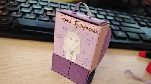 Подобный рюкзак я использовала в одной открытке, но этот будет чуть посложнее. А что будет внутри рюкзачка, пока это сюрприз, но ненадолго... Для начала достанем из коробка внутренний ящичек и раскрасим его в нужные цвета. Я решила делать по мультфильму "София Прекрасная", но можно в любые цвета. Теперь берем внешнюю коробочку и обклеиваем её цветной бумагой. Если бумага полупрозрачная, то лучше наклеить два слоя, иначе будет видна надпись на самом коробке. И теперь будем превращать уже красивый коробок именно в рюкзачок...