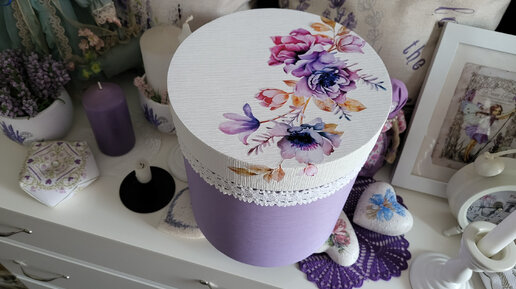 Уже около 10 лет у меня хранилась большая картонная коробка, по типу шляпной, темно красного цвета. Она очень вместительная, в ней лежат клубки шерсти. Однако, ее цвет совершенно мне не подходит. Не люблю красный, да и не к месту он мне. Комната, где стоит коробка - в бело лиловой гамме. Я решила полностью переделать эту коробку и использовать для этого ОБОИ, которыми оклеены стены комнаты. Я уже показывала, как я сделала подставку для цветов, используя те же обои. Вышло просто отлично!