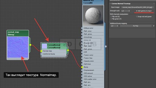Что такое Normalmap? Normalmap (Карта нормалей) – это более продвинутый вариант бампа. Такие текстуры, как правило, дают более выраженный рельеф на материале, чем обычный бамп. Но просто назначить в слот материала такую текстуру нельзя — нужна специальная текстура-прослойка: Готово...