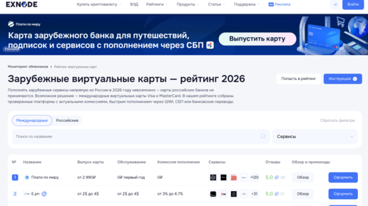 Как сделать иностранную карту — вопрос, который в 2026 году стал практической необходимостью для тех, кто оплачивает подписки, игры и цифровые сервисы. Российские карты не проходят автосписания, отклоняются в зарубежных магазинах и не подходят для многих иностранных онлайн-платформ, поэтому пользователи ищут понятный способ, как сделать иностранную карту без лишних рисков и сложностей. Мониторинг виртуальных карт Exnode помогает не тратить часы на сравнение условий вручную: на одной площадке можно увидеть комиссии, сроки выпуска, поддерживаемые валюты и способы пополнения...