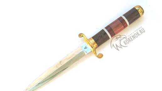 Кортик, который сегодня рассмотрим в деталях, изготовлен мастером своего дела. Оговоримся сразу почему это не кинжал... Максимальное соотношение длины к ширине клинка кинжала должно быть не более 6 к 1. Кортик имеет более длиный клинок. Данный кортик имеет следующие размеры: Общая длина мм: 330, Длина клинка мм: 190, Ширина клинка мм: 25. Толщина клинка мм: 4.0 Твердость клинка по шкале HRC:59-60 Клинок кованый, ромбовидной формы из стали 95х18 Рукоять: Венге, бубинго, палисандр. Крестовина и навершение литые из латуни...