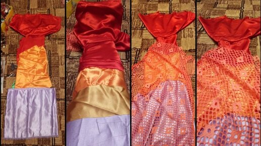 Решила шить его не так, как шила 7 лет назад предыдущий. Но если б только ещё помнила, как шила тот)). Взяла разные по цвету кусочки ткани (какие были и какие вроде сочетаются, если нет - перекрасим, чёрный всё сможет) обшила "коконом" вокруг ног. Нашла старую блузку, на которой висела такая "сетка", распорола, испортила👻 и нашла эту аля чешую, начала прикреплять поверх. Пока что на стадии шитья это всё, да и что может быть, когда новоиспеченному хвостику нет даже суток?) Но, не доделав до конца, не удержалась, не смогла совладать с руками, (которым только дай ткань!)...