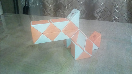 Волк из змейки Рубика Этап 1: загнуть край змейки Этап 2: отсчитать 2 верхнего треугольника и там загнуть. Этап 3:на том же месте загнуть через 1 треугольник. Получается голова волка. Этап 4: повернуть через 1 треугольник в левую сторону. Это будет туловище. Этап 5: повернуть на том же месте к голове волка ещё раз в левую сторону...