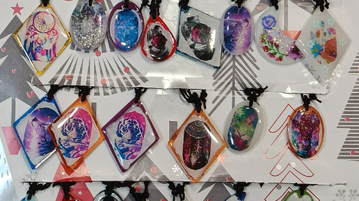 На маркетплейсах можно купить силиконовую форму любого формата. Для кулончиком много вариантов любой глубины и формы, но раз у нас кулончик, форма должна быть тонкой. Также я делала и серьги. Но тема серёжек мне не очень близка. Делала только на заказ, а не для свободной продажи. Для создания нужно не так уж и много: форма, эпоксидная смола, красители, если требуется, акриловая краска (белая) и наклейки для ногтей. Да-да, наклейки для ногтей. Всё гениальное - просто. На примере этого фото расскажу, как я их делала...
