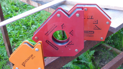 Пройдясь по строймагазину был удивлен стоимостью магнитных уголков для сварки, цены на них в среднем 600-800 рублей! Не долго думая решил все таки сделать его самостоятельно благо в гараже давно лежал без дела магнит от динамика Прикупил в том же магазине два угловых соединителя за 40 рублей и три удлиненные гайки Для начала нам необходимо найти небольшой кусок магнита В уголках просверливаем по одному отверстию Примеряем магнит, если ничего не выперает, то можно скрепить вместе оба уголка...