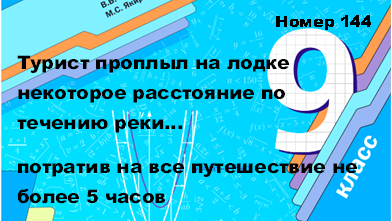 Пусть турист проплыл расстояние из пункта «А» в пункт «В» и вернулся обратно. Для решения задачи составим неравенство, которое будет обозначать, что общее время туда и обратно не превышает 5 часов. Почему, составляя неравенство, мы сравниваем именно время, а не, допустим, скорость. Ведь скорость нам тоже дана. Ответ на этот вопрос прост: время, обозначенное в задаче и ограниченное 5 часами, является основным условием, а скорость, как бы, второстепенна. Иначе говоря, турист должен «уложиться» в эти 5 часов, и не важно, как он это сделает...