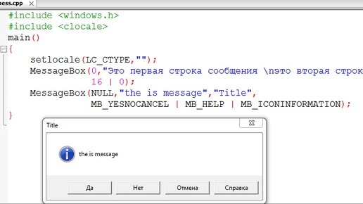 Давайте рассмотрим структуру API-функции MessageBox, выглядит она так: MessageBox(hwnd,"Текст сообщения","Заголовок", кнопки | иконка) Первым параметром идет hwnd - дескриптор окна, его принято записывать еще так: hWnd, что значит handle Window - "хэндл окна". Здесь указывается хэндл родительского окна, от которого происходит сообщение. Если такого окна нет, то в этот параметр можно записать значение 0 или NULL. Следущим параметром MessageBox, идет текст сообщения. Третий параметр это заголовок, здесь, я думаю, все понятно, перейдем к четвертому параметру...