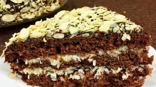 Этот кекс стоит каждой минуты, затраченной на его выпечку, ну, а результат превосходит самые смелые ожидания!!! ИНГРЕДИЕНТЫ: Корж: Мука 400 гр. Сахар 330 гр. Ванильный сахар 1 ч.л. Какао порошок 6 ст.л. Разрыхлитель 1.5 ч.л. Сода 1.5 ч.л. Яйца 2 шт. Молоко 1 стакан. Растительное масло 1/2 стакана. Вода 1 стакан. Крем: Молоко 1 стакан Сахар 100 гр. Сливочное масло 100 гр. Кокосовая стружка 150 гр. Глазурь: Сахар 4 ст.л. Какао порошок 4 ст.л. Сливочное масло 50 гр. Молоко 100 мл. Миндальная стружка или любые орехи 130 гр...