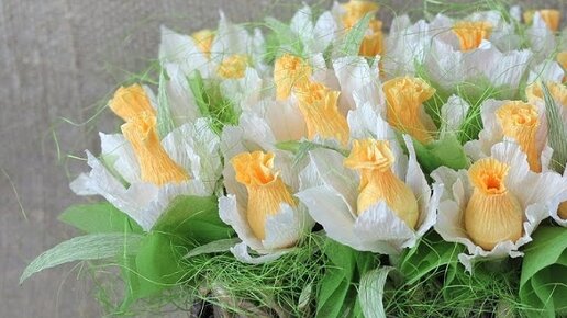 "Нарциссы — оптимистичный цветок и надежный." (Т. Тюдор) Нарциссы — цветы плодородия, весны, рыцарства, безответной любви и тщеславия. Нарцисс из рода амариллисовых, с греческого переводится как "одурманивать". Он является символом самовлюбленности, плодородия, весны, рыцарства, безответной любви, тщеславия. Он является довольно противоречивым. В Китае нарцисс является символом счастья и начала, в Германии его называли вампиром, в других странах он являлся символом счастливого союза. Давайте сделаем этот красивый цветок из гофрированной бумаги...