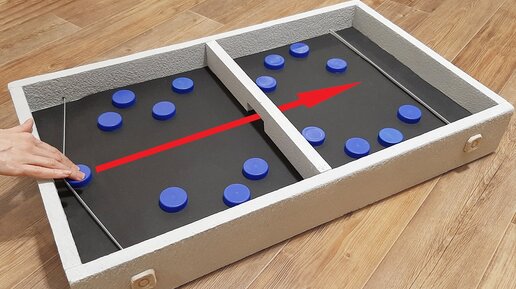 Чем занять ребенка, когда долго приходится сидеть дома? Книжки уже не интересны, а игры все переиграны? Надо сделать еще одну игру своими руками! Сегодня делаем чудо настольную игру, в которую с удовольствием играет вся наша семья! Как она правильно называется, я честно сказать не знаю, но в интернете все называют ее по разному. Вот какие названия я нашла: Для игры я использую остатки пенополистирола, черную бумагу, резинку, роль игральных шайб у меня послужат обычные крышки от пятилитровых пластиковых бутылок...
