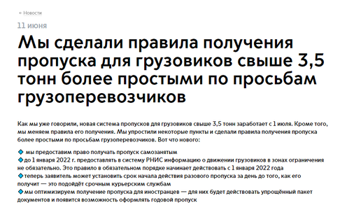 11 июня московские власти наконец разродились решениями повисших в воздухе вопросов и проблем в сфере оформления грузовых пропусков в Москву (на МКАД,ТТК, СК) Сначала появились новости на странице Дептранса Москвы на мосру: Подробную аналитику я готовлю и выложу на своём закрытом телеграм-канале. Какая-то ее часть окажется и здесь, в Дзене, не пропустите. Ну а пока коротко прокомментирую основные тезисы обзора от Мостранса: Мы сделали правила получения пропуска для грузовиков свыше 3,5 тонн более...