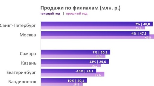 Пошаговый пример как сделать в Excel крутую диаграмму для отчета. "Итоги за период по длинному списку филиалов или товарных категорий" - обычная часть любого отчета. Рассмотрю шаг за шагом подготовку отчета по анализу финансовых результатов работы филиалов. У компании "Техпром лизинг" 11 филиалов, для которых необходимо сравнить текущий год с прошедшим. Казалось бы тривиальная задача, но за два шага, я покажу 12 приемов, которые превратят обычную диаграмму в удобный инструмент для руководства. А вас, как создателя, в ценного сотрудника...