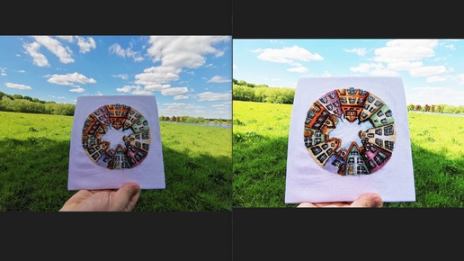 Для примера, возьму вот такую фотографию. Сделана на улице, в тени. На фотографии цвет канвы отдает в сиреневый и видны заломы. Их нужно убрать, а также сделать цветокоррекцию.