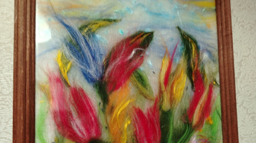 Моя первая работа в технике "Шерстяная акварель" - панно "Бабочка". Бабочка вышла не очень, но я поняла, что это очень интересно. Затягивает. Бабочку я потом разобрала и сделала панно "Лето". Чем хороша шерстяная акварель, тем, что можно переделывать много раз, пока не получится то, что хочется. Мне потом это панно захотелось снова переделать. Для тех, кто будет пробовать. Шерсти надо добавлять по чуть - чуть, по волокнам и очень немного, листочки и лепестки делать поуже, потому что, когда работа придавливается стеклом, все листики и лепесточки становятся шире...