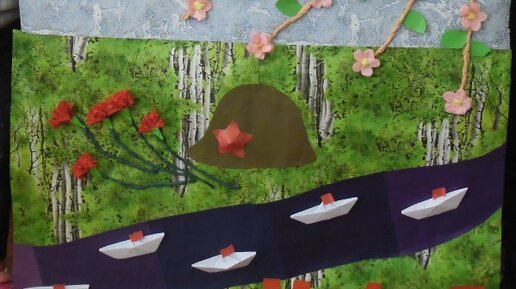 Мои малыши очень любят делать коллективные плакаты к праздникам. Вот, и в этот раз они попросили сделать красивый плакат к 9 Мая. Я, конечно, не смогла им отказать. О том, как мы его делали, я расскажу вам в этом МК. Сразу скажу, мы его сделали за два урока, потому что время поджимало. Вообще-то на него может потребоваться 3 урока. 1. Итак, приступим. Я склеила 3 листа обоев для фона – основа плаката. Склеила вертикально 2 листа с березками. Сверху приклеила лист горизонтальный – голубое небо. 2...