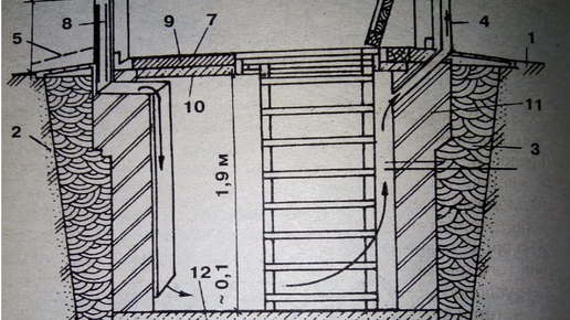 Сегодня хочется рассказать, как правильно обустроить подвальное помещение частного дома для хранения запасов на зиму. Правильная конструкция данного помещения сохранит необходимый микроклимат помещения и не даст появиться сырости, которая вредит не только конструкциям подвала, но и хранящемся продуктам или вещам. Проект подвала или погреба. 1. Грунт 2. Утрамбованная смесь гравия и песка 3. Прослойка глины жирных образцов 4. Вытяжной канал вентиляции 5. Отмостка 6. Стена дома 7. Рубероид или другая гидроизоляция 8...