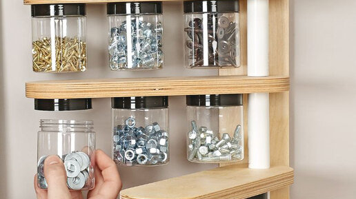 Не выбрасывайте банки от детского пюре. Делаем полку в мастерской для мелочей.