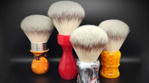 Сегодня я расскажу и покажу мои помазки из синтетики. Да, помимо помазков из барсука я использую помазки из синтетики. Как ни странно, но все они практически с одинаковым ворсом и отличаются они только ручками и лофтом, все узлы на 26мм - ни меньше и не больше, для меня самый идеальный размер для такой синтетики, в отличии от помазков из барсука, у которых с меньшим размером работать проще всем и особенно новичкам. Первый помазок (на первом фото слева) был приобретен мной еще где то 2 года назад у Вадима...