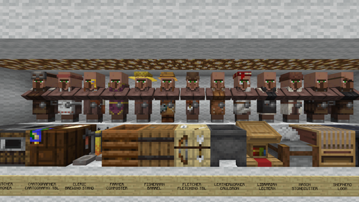Все профессии жителей в формируются через взаимодействие с уникальными рабочими блоками, которые задают их роль в деревне. Изначально жители появляются без профессии, но, найдя подходящий блок, они обретают одну из 13 специальностей. Эти блоки не только определяют род деятельности, но и необходимы для поддержания торговли: без них житель не может обновлять свои предложения. У каждого жителя есть внутренний инвентарь на восемь ячеек, обычно заполненный едой (например, хлеб, картофель) или семенами для работы...