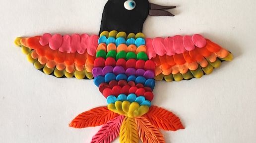 Аппликация из пластилина на картоне " Разноцветная птичка". Пошаговая инструкция по фото для детей.